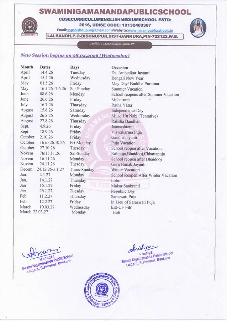 Holiday List 2026-2027